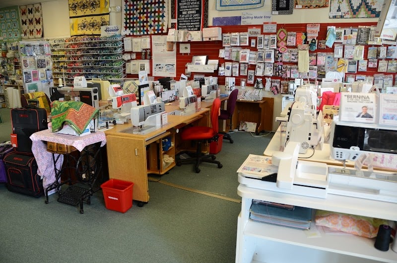 The image showcases the interior of Quilt Quarters, a sewing store filled with sewing machines, colorful fabrics, and quilting supplies.