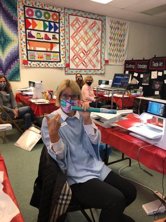 The image shows a vibrant sewing store interior with colorful quilts displayed on the walls.