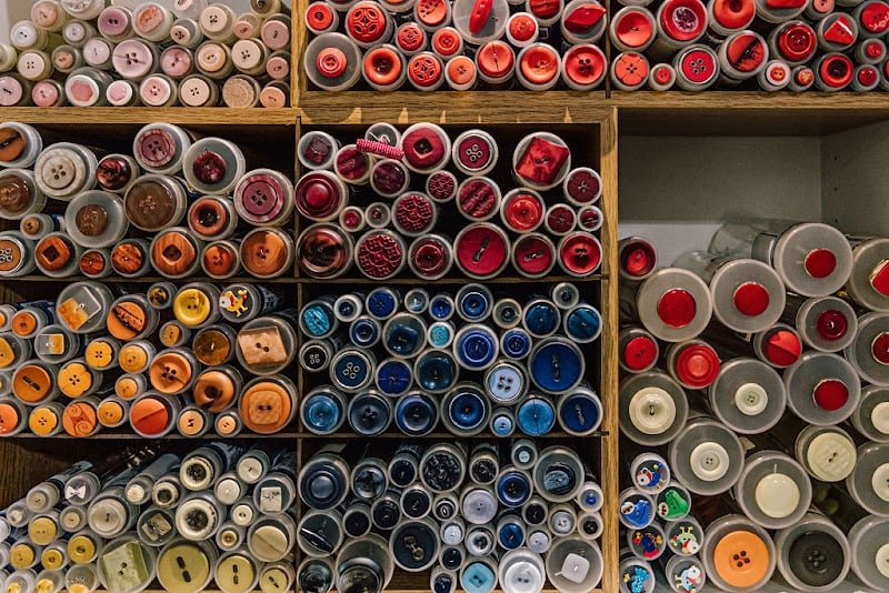 The image showcases a vibrant display of buttons organized in wooden shelves at The French Seam sewing store.