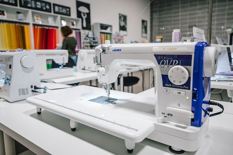 The image showcases a bright sewing store interior featuring a Juki sewing machine prominently on a white table.