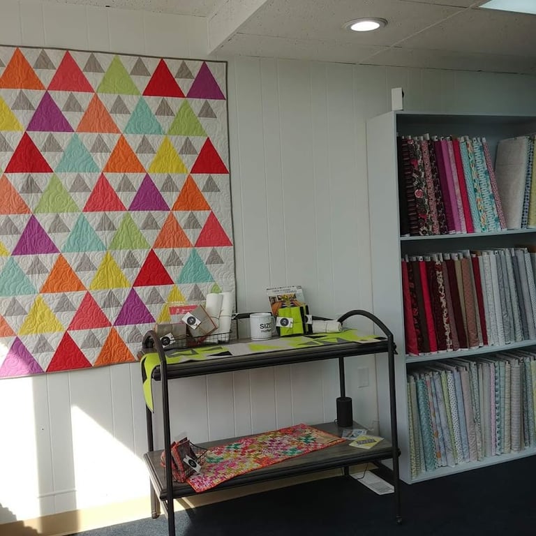The image shows the interior of Quilts Plus, featuring a colorful quilt with triangular patterns on the wall.