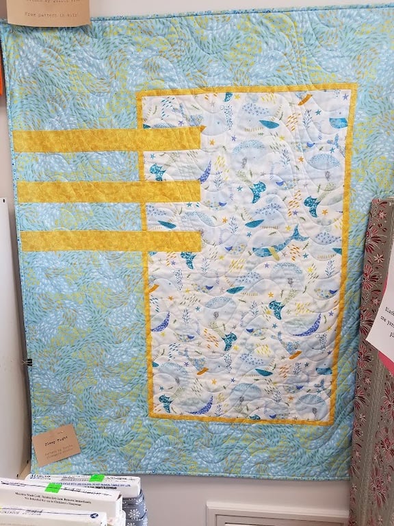 The image features a colorful quilt displayed on a wall, showcasing a design with blue and yellow fabrics.