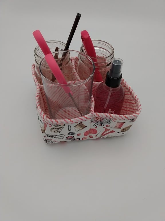A colorful fabric organizer holds various clear jars and tools, including pink and black pens, in a sewing store setting.