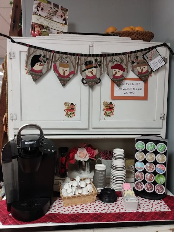 The image shows a cozy corner in Always In Stitches, featuring a Keurig coffee maker, cups, and a decorative banner with snowman motifs.