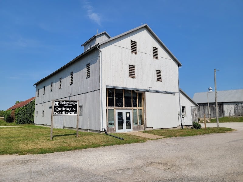 The image shows the exterior of Heritage Designs, a sewing store housed in a rustic barn-like building.