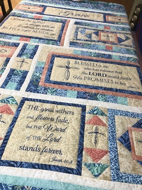 The image showcases a beautifully crafted quilt displayed on a table at Bloomin Quilt Shop.