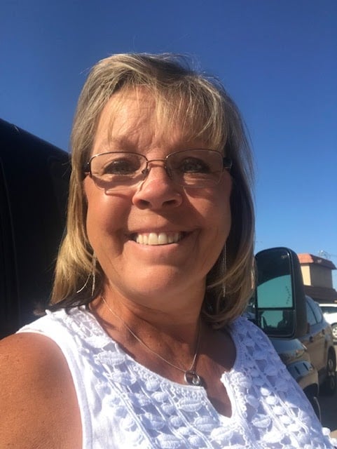 The image features a smiling woman with glasses, standing outdoors in bright sunlight. She is wearing a white top and appears to be in a casual setting, possibly near a vehicle.
