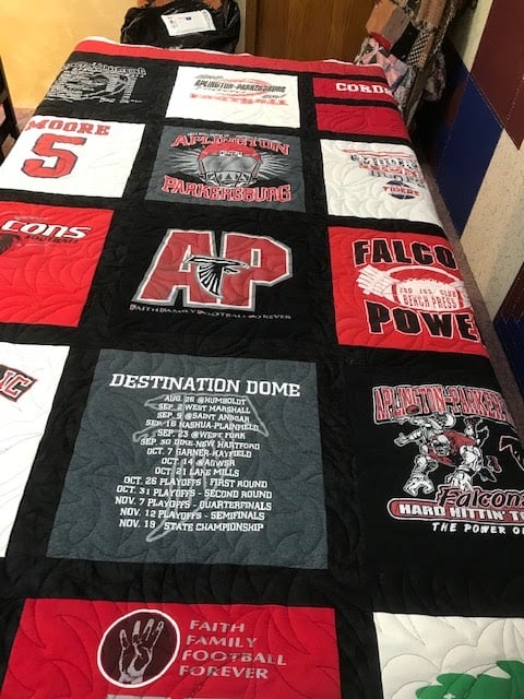 The image features a vibrant quilt displayed at Bloomin Quilt Shop, showcasing various team logos and sports themes.