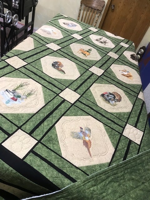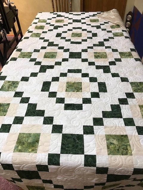 A beautifully quilted table featuring a geometric pattern in green and cream colors is displayed prominently.