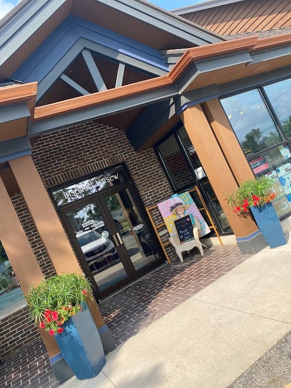 The image shows the entrance of Inspired to Sew, a sewing store, featuring a welcoming facade with large glass doors and decorative planters.