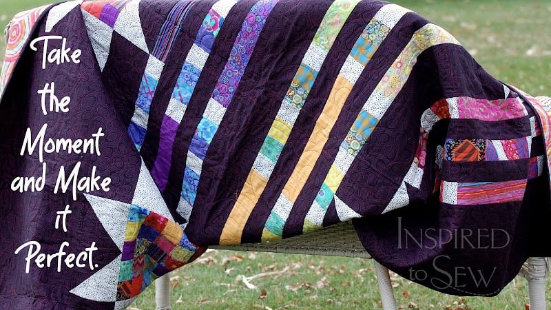 A vibrant quilt featuring bold stripes and intricate patterns is displayed outdoors, showcasing the colorful fabrics available at Inspired to Sew.