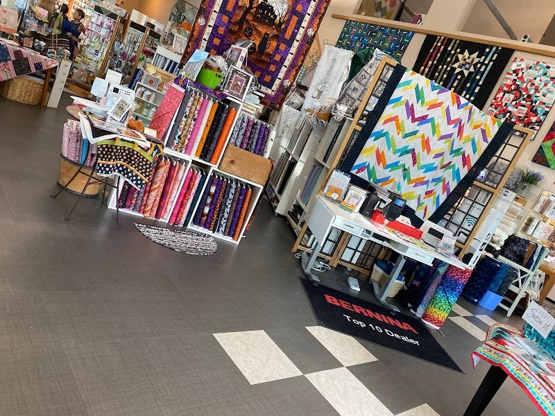The image showcases the interior of Inspired to Sew, a vibrant sewing store filled with colorful fabrics and quilting supplies.