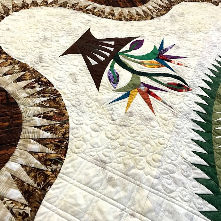 The image showcases a beautifully crafted quilt featuring intricate floral designs and vibrant colors.