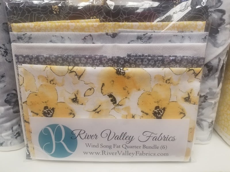 The image features a neatly packaged Wind Song Fat Quarter Bundle from River Valley Fabrics, showcasing vibrant yellow floral patterns alongside gray and white fabrics.