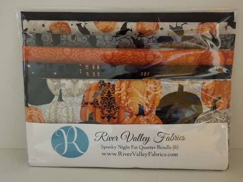 A packaged fat quarter bundle from River Valley Fabrics features six Halloween-themed fabrics with designs including pumpkins, skulls, and bats.