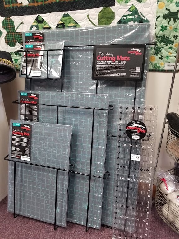 The image showcases a display of various cutting mats and rulers at River Valley Fabrics, a sewing store.