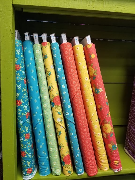 The image showcases a vibrant display of rolled fabrics in various colors and floral patterns, neatly arranged on green shelving.
