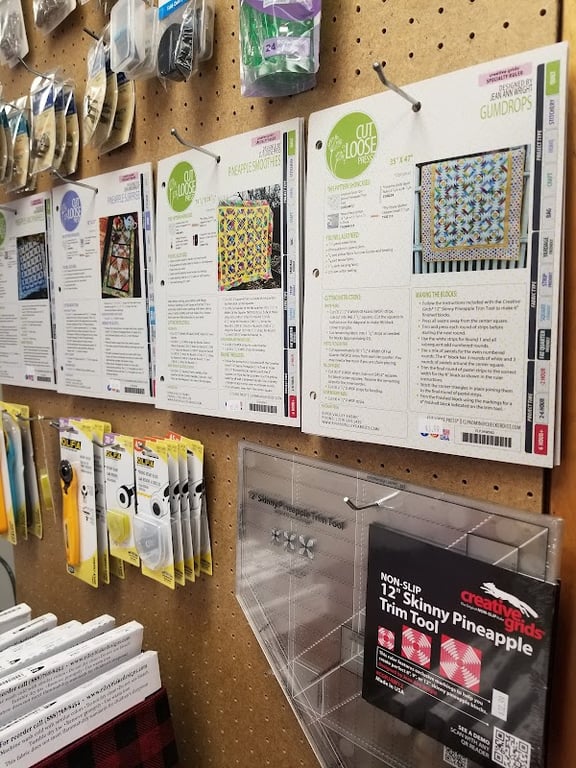 The image shows a display wall at River Valley Fabrics featuring sewing patterns and tools. Visible items include colorful quilt patterns, rotary cutters, and a trim tool.