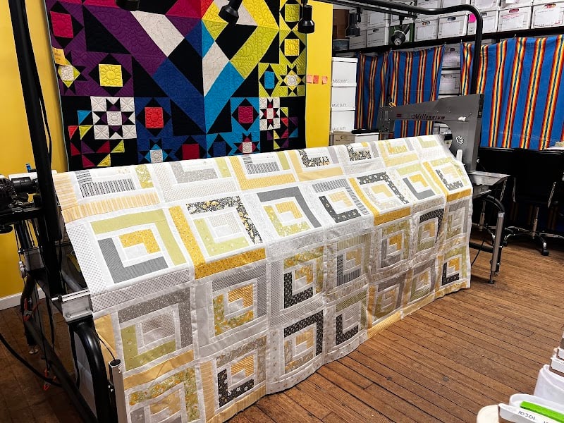 The image showcases a vibrant sewing studio with a colorful quilt displayed on a longarm quilting machine.