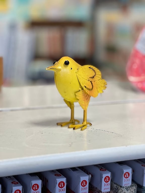 A cheerful yellow bird figurine stands on a countertop in Hen & Chicks Studio, surrounded by neatly arranged spools of thread.