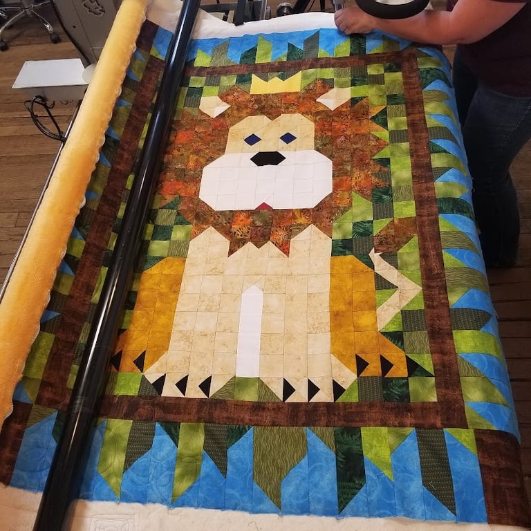 A person is quilting a colorful lion-themed quilt on a longarm sewing machine in a cozy sewing studio.