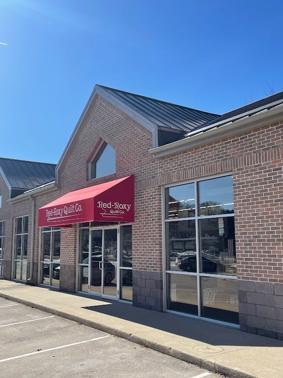The image shows the exterior of Red-Roxy Quilt Co, a sewing store with a red awning displaying its name.
