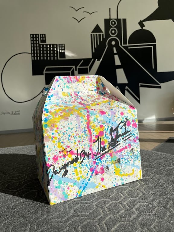 A colorful, artistic box from Designed By The Streets sits on a textured surface, with a vibrant splatter design.
