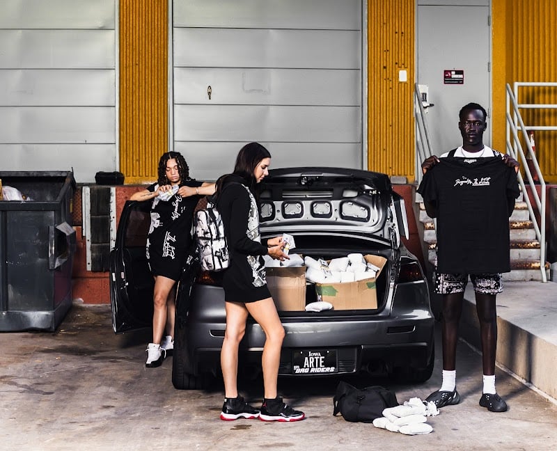 The image shows a group of young people unloading items from a car in an urban setting. They are handling clothing and accessories, likely related to a sewing or fashion project.