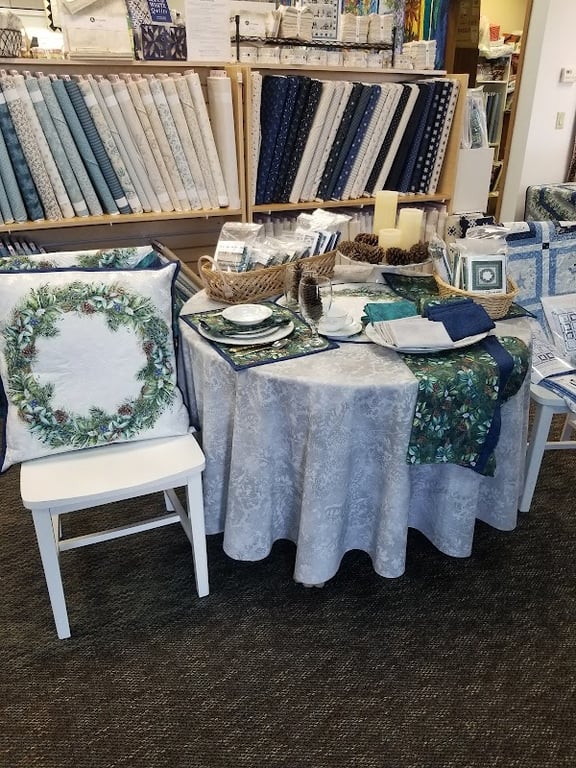 The image showcases a cozy sewing store display featuring a table adorned with decorative pillows, fabric swatches, and quilting supplies.