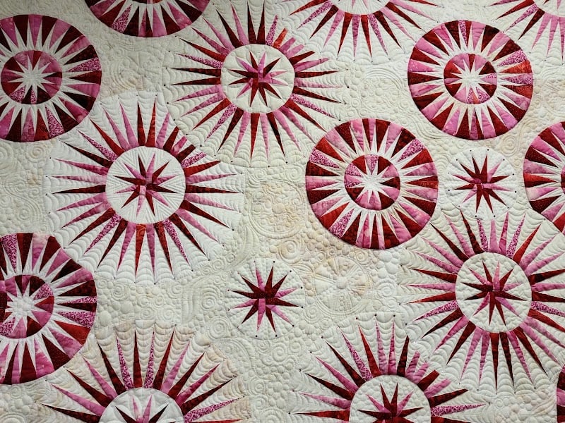 This image showcases a beautifully crafted quilt featuring vibrant pink and white starburst patterns against a textured background.