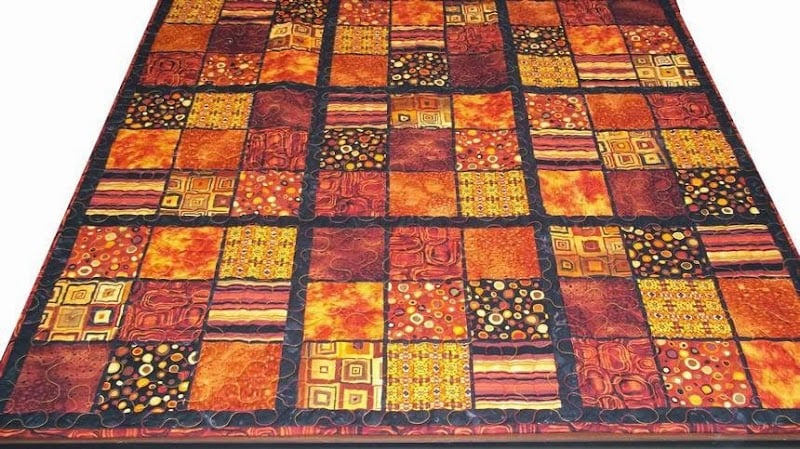 This image showcases a vibrant quilt featuring a patchwork design with warm colors like orange, yellow, and red.