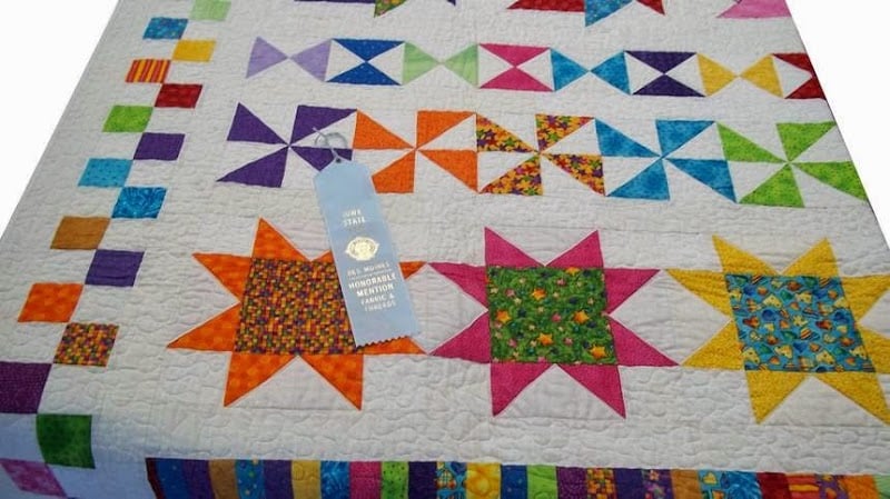 A vibrant quilt featuring colorful star and pinwheel patterns is displayed prominently, showcasing the craftsmanship of the Family Quilt Shop.