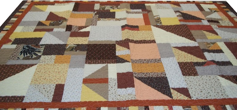 A colorful patchwork quilt featuring various geometric patterns in warm tones of brown, orange, and cream is displayed prominently.