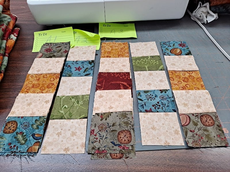 The image shows neatly arranged fabric squares in various colors and patterns, laid out on a work surface.