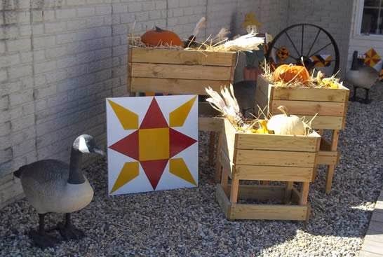 The image shows a charming outdoor display at Family Quilt Shop, featuring wooden crates filled with pumpkins and straw.