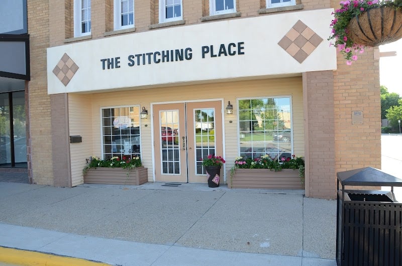 The image shows the exterior of The Stitching Place, a sewing store featuring a welcoming entrance with double doors and large windows.