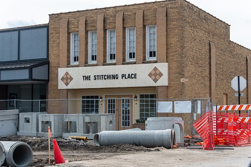 The image shows the exterior of The Stitching Place, a sewing store, featuring a brick facade and large windows.