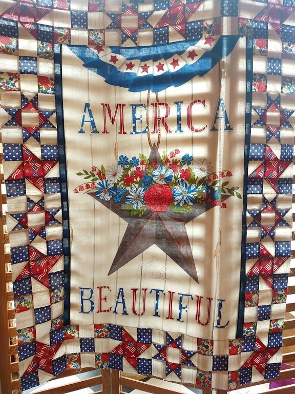 The image features a decorative fabric panel displaying the phrase "America the Beautiful," surrounded by a patchwork border of red, white, and blue stars.