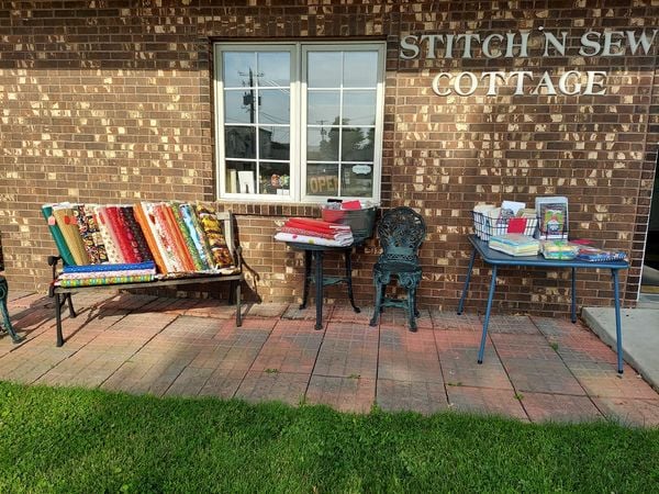 The photo shows the exterior of Stitch 'N Sew Cottage, featuring colorful fabric rolls displayed on a bench and tables.