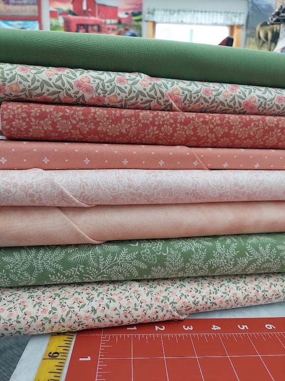 A stack of colorful fabrics in various floral and solid patterns is displayed at Stitch 'N Sew Cottage.