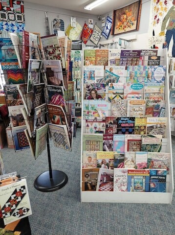 The image shows the interior of Stitch 'N Sew Cottage, featuring a display of colorful quilting and sewing pattern books on stands.