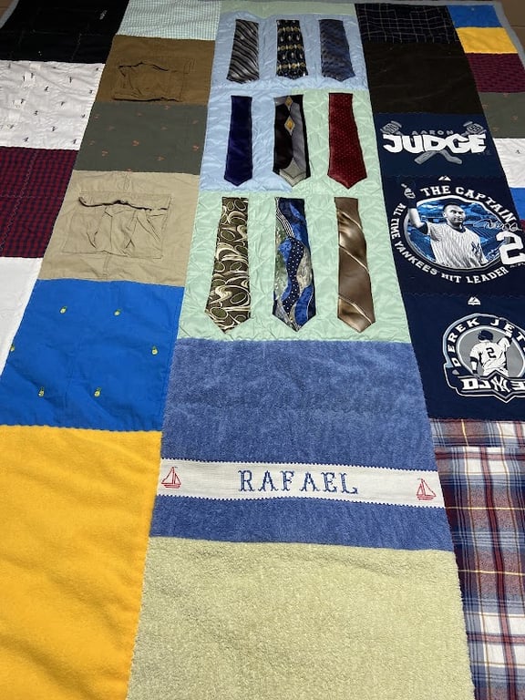 The image showcases a colorful quilt made from various fabrics, including ties and shirts, with a personalized embroidered name "Rafael.