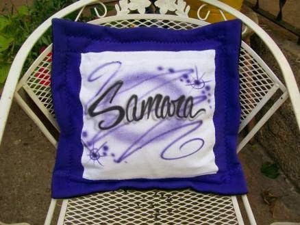 A decorative pillow featuring the name "Samara" in elegant script is displayed on a white metal chair.