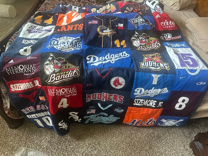 The image features a colorful quilt made from various sports jerseys, showcasing team logos and numbers.