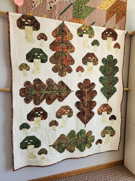 A colorful quilt featuring autumn-themed leaves and mushrooms hangs on a display in Blue Sky Quilt Shop.
