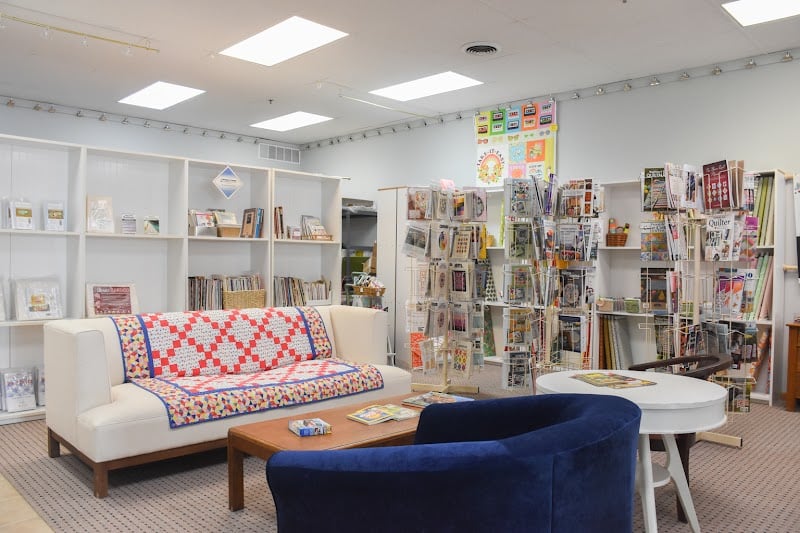 The interior of Blue Sky Quilt Shop features cozy seating with a colorful quilt, surrounded by shelves filled with sewing patterns, fabrics, and quilting supplies.