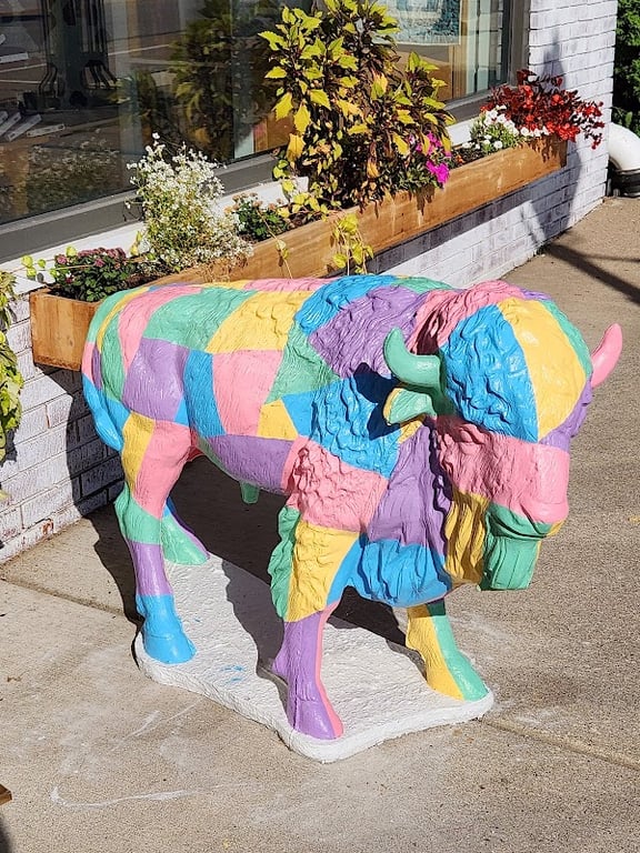 A colorful, patchwork bison sculpture stands outside the Blue Sky Quilt Shop, surrounded by vibrant flowers in planters.