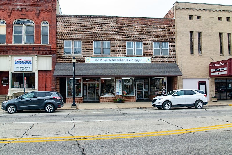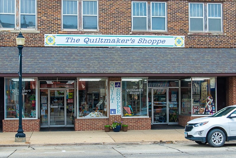 The image shows The Quiltmaker's Shoppe, a charming sewing store with large windows displaying colorful fabrics and quilting supplies.