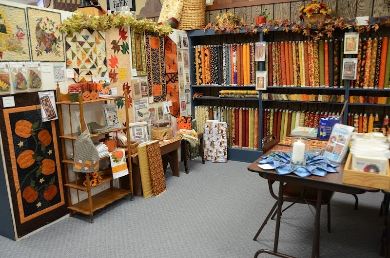 The Quiltmaker's Shoppe features vibrant shelves filled with autumn-themed fabrics in oranges, yellows, and greens.