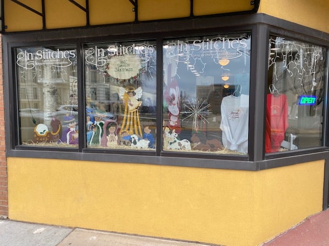 The photo showcases the storefront of "In Stitches," a sewing store featuring colorful fabric displays, sewing kits, and decorative items.